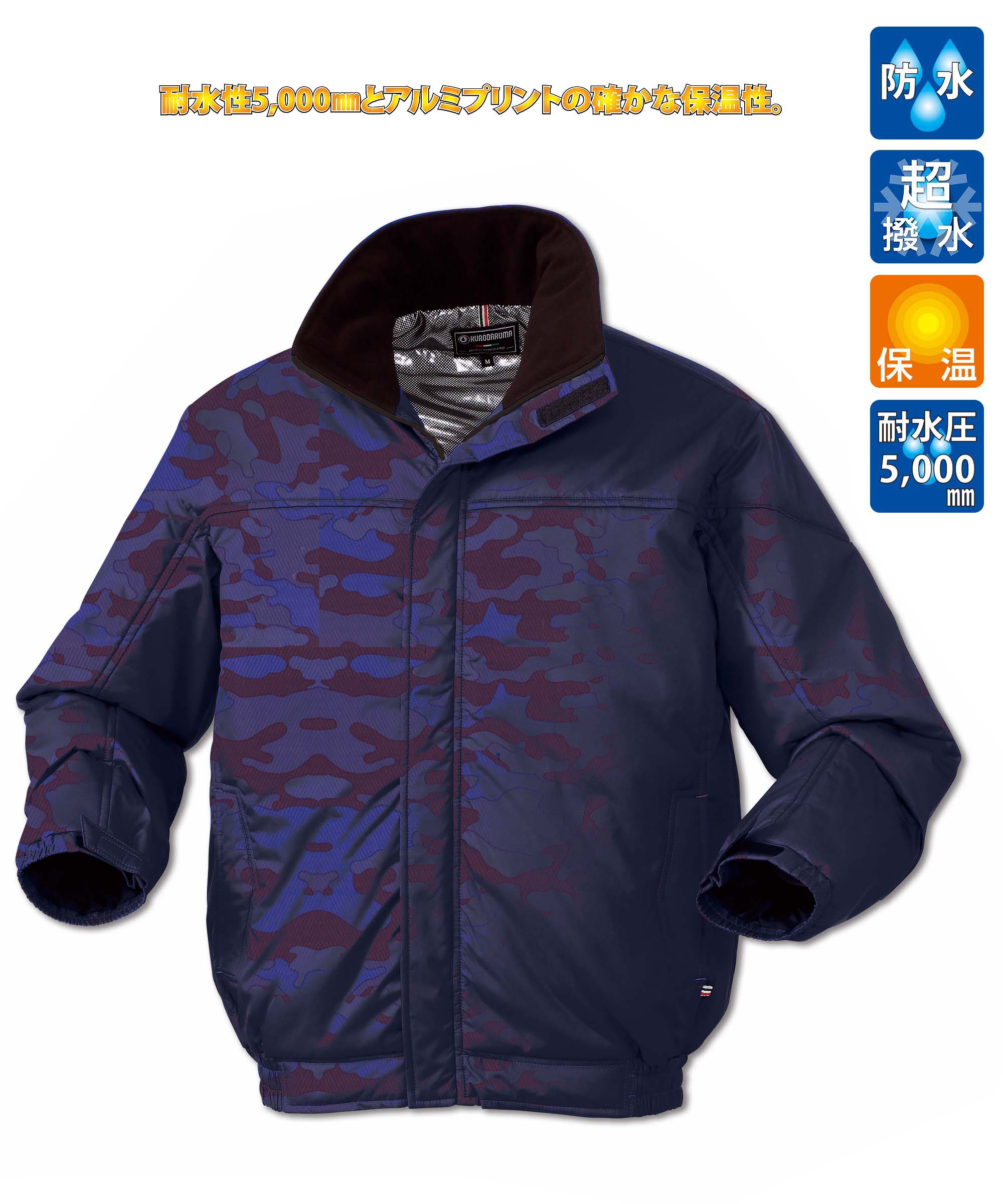 リップストップ素材の裏面をポリウレタン加工する事で耐水性5,000mmの防水性と高い防風性を実現。更に、裏地には保温性に優れたアルミプリント素材を採用する事で、衣服内を常に暖かく快適に保ちます。衿はフリース仕様で暖かく、冷たい外気の侵入をシャットアウト!表地のリップストップ素材は引裂き強度が強く、表面には超撥水加工が施されています。