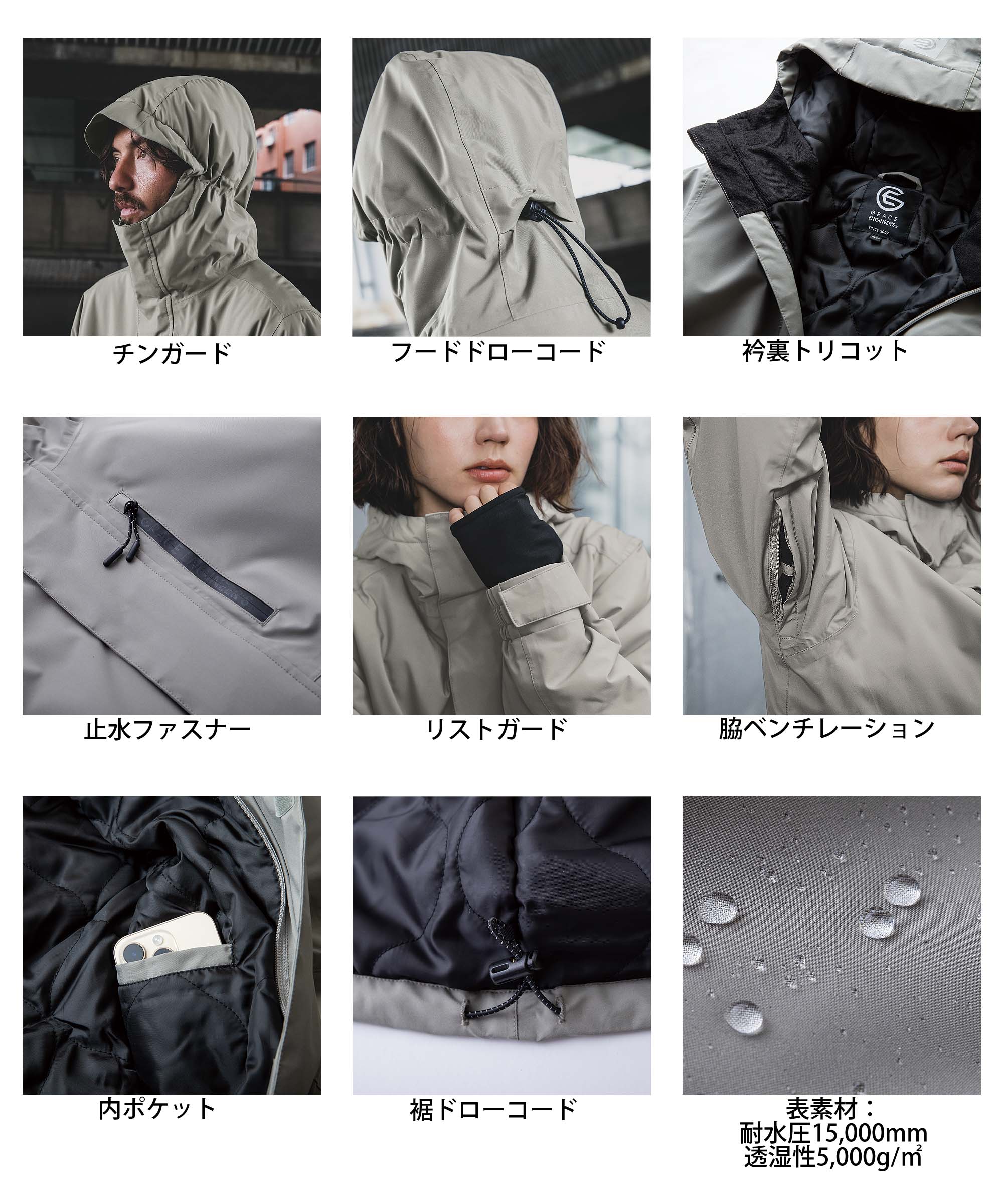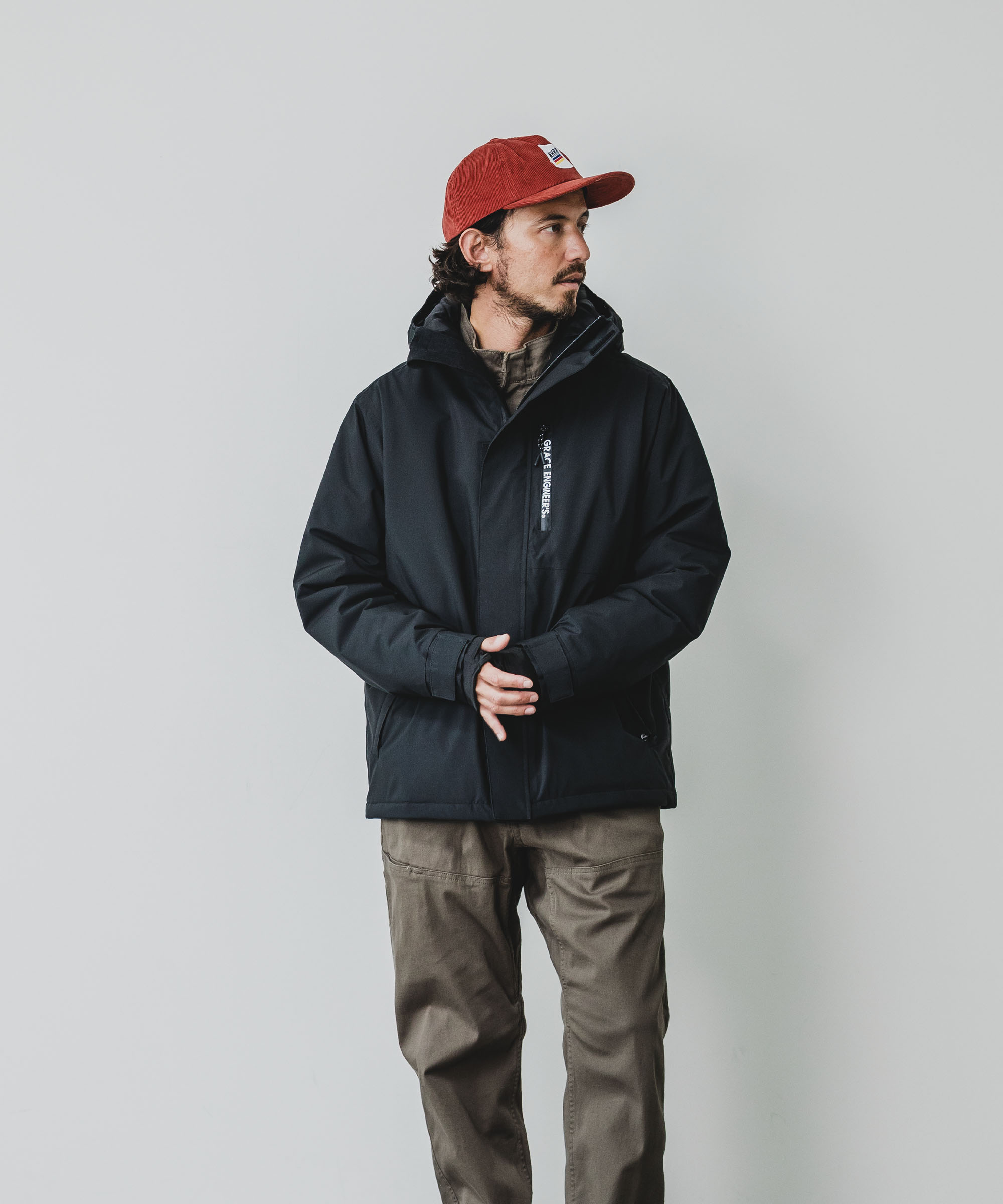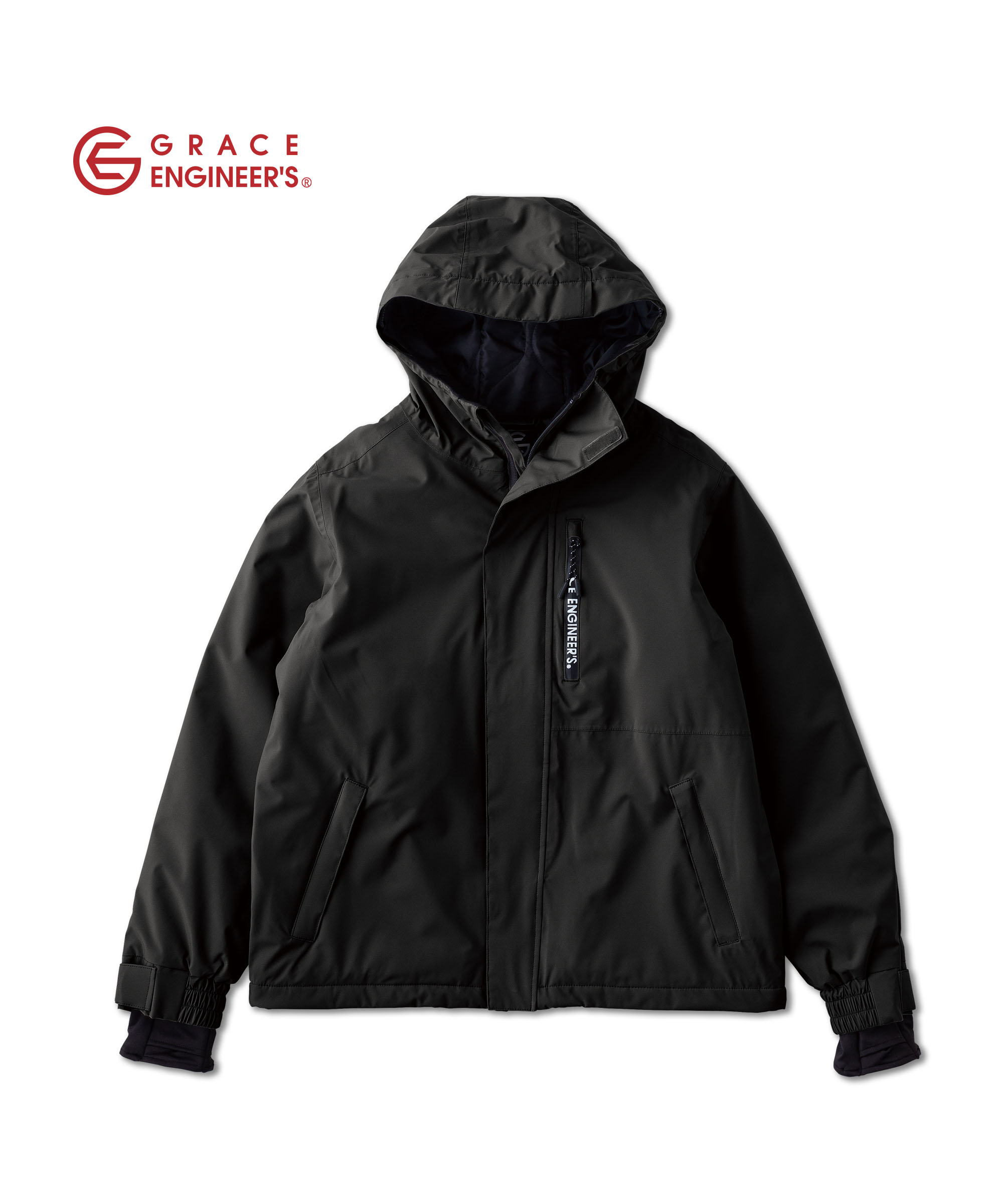防風・防水のシェルジャケットです。つなぎの上から着用した際に絶妙なバランスの丈がこだわりです。