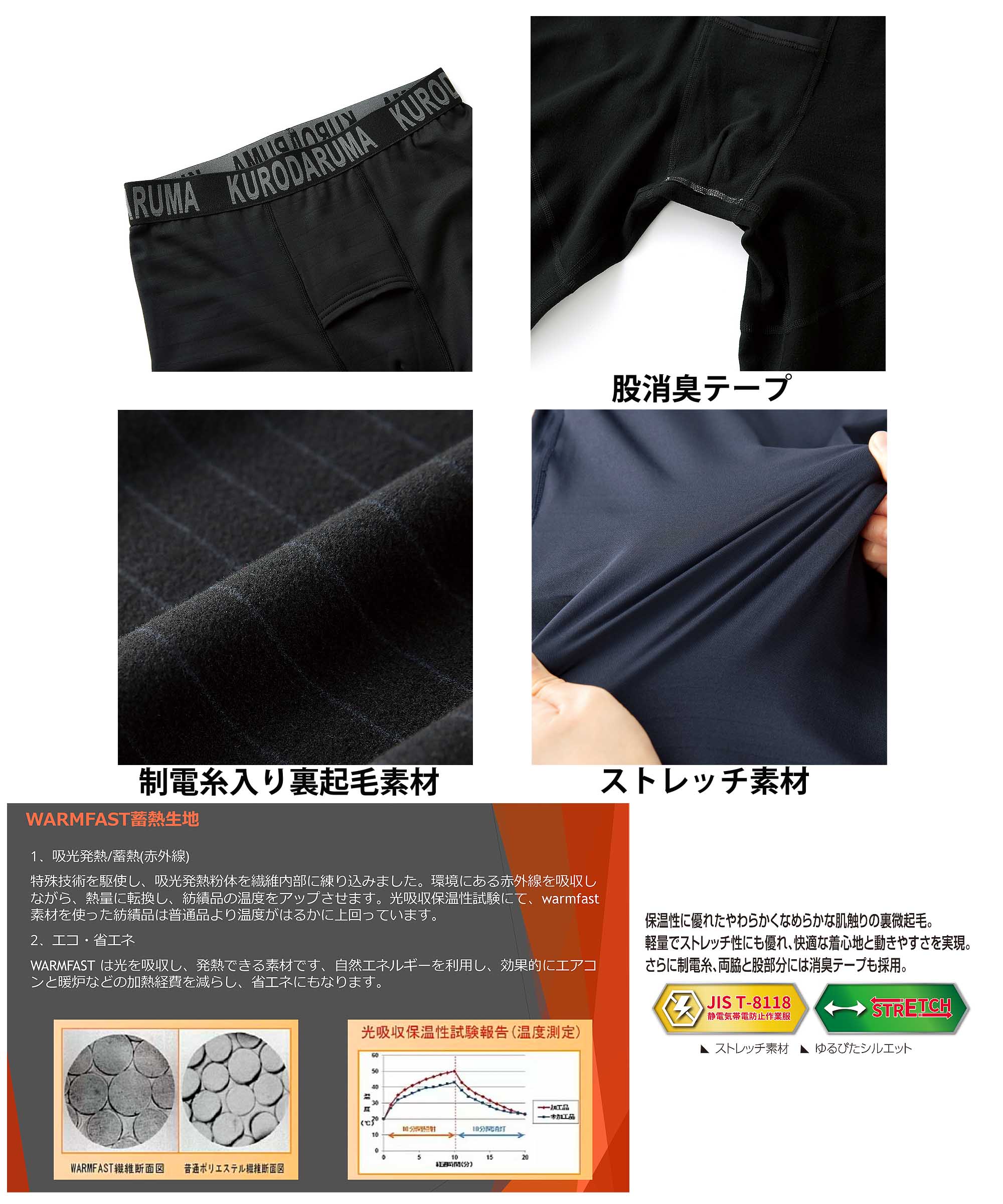 特長: 裏面微起毛、ストレッチ素材、帯電防止素材