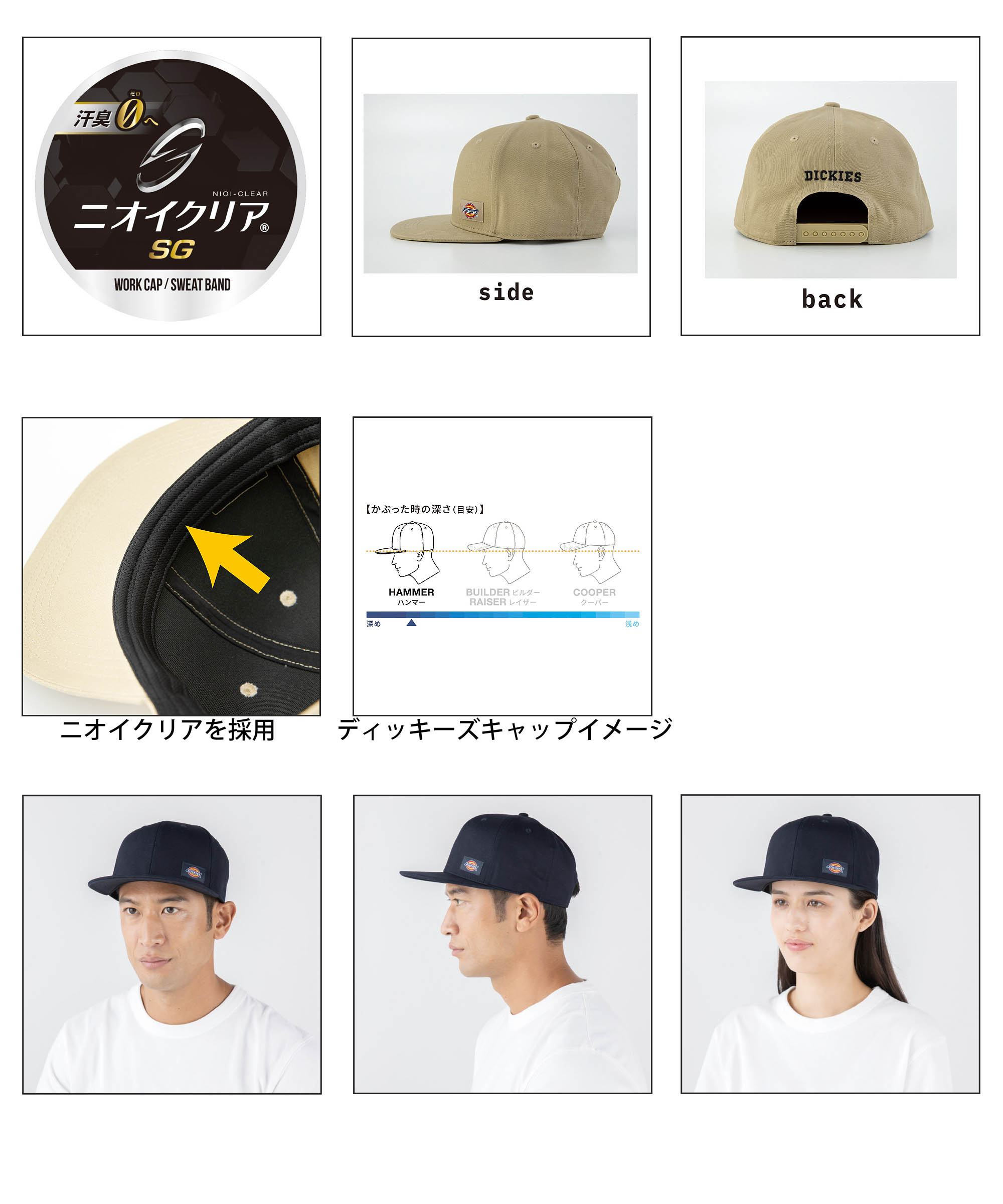安定感のある深いかぶり心地のハンマータイプ。スタイリッシュな印象のフラットバイザーを採用。すべり部分に汗臭防止のニオイクリアの芯地を使用。ワンポイントのネームもシンプルながら引き立つデザインです。