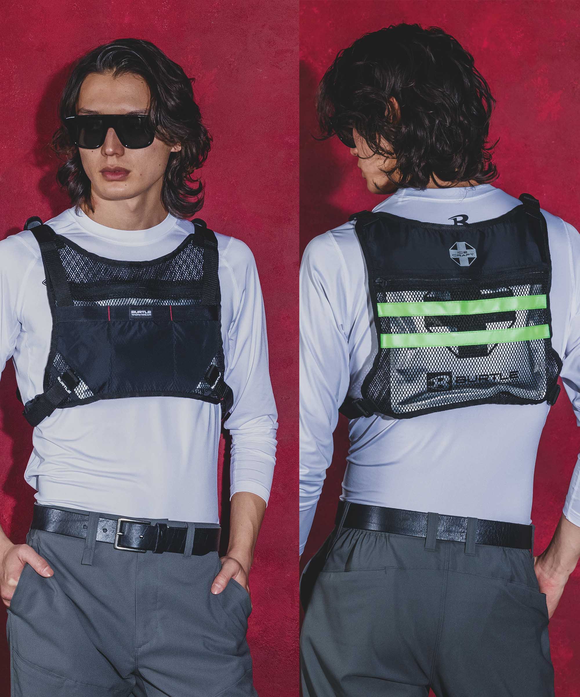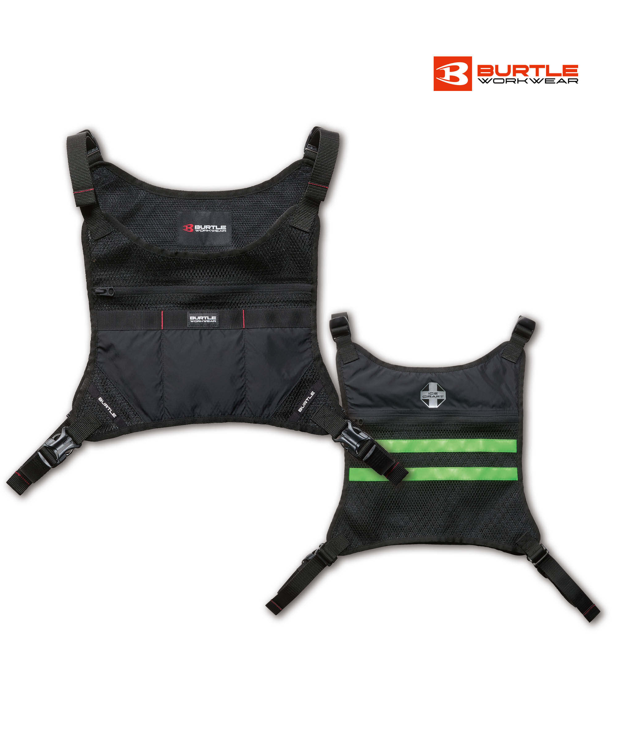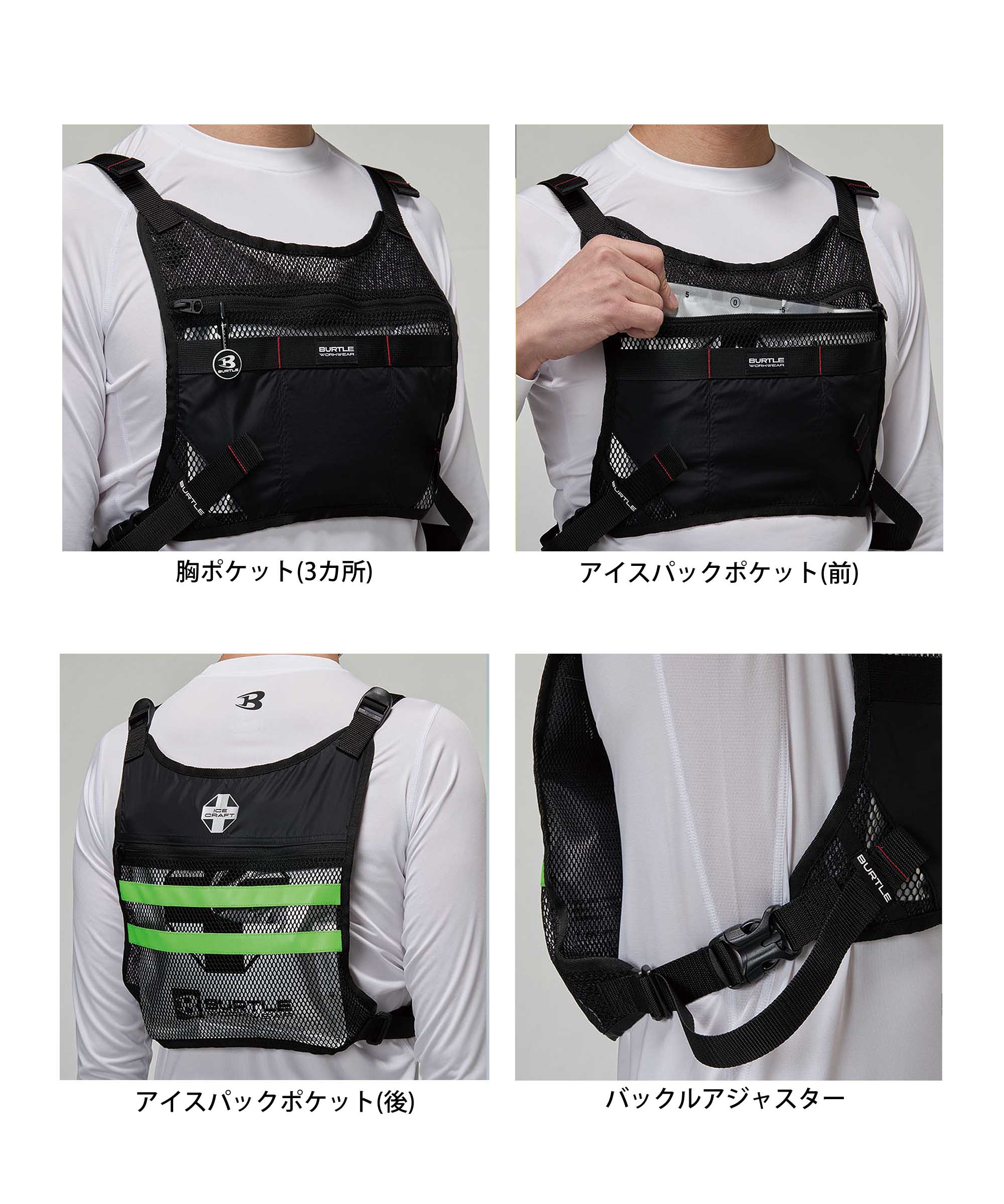 フロント、背面に大型アイスパックを収納するミリタリールックなベストです。アイスパック2個付き。約5時間から8時間保冷。
