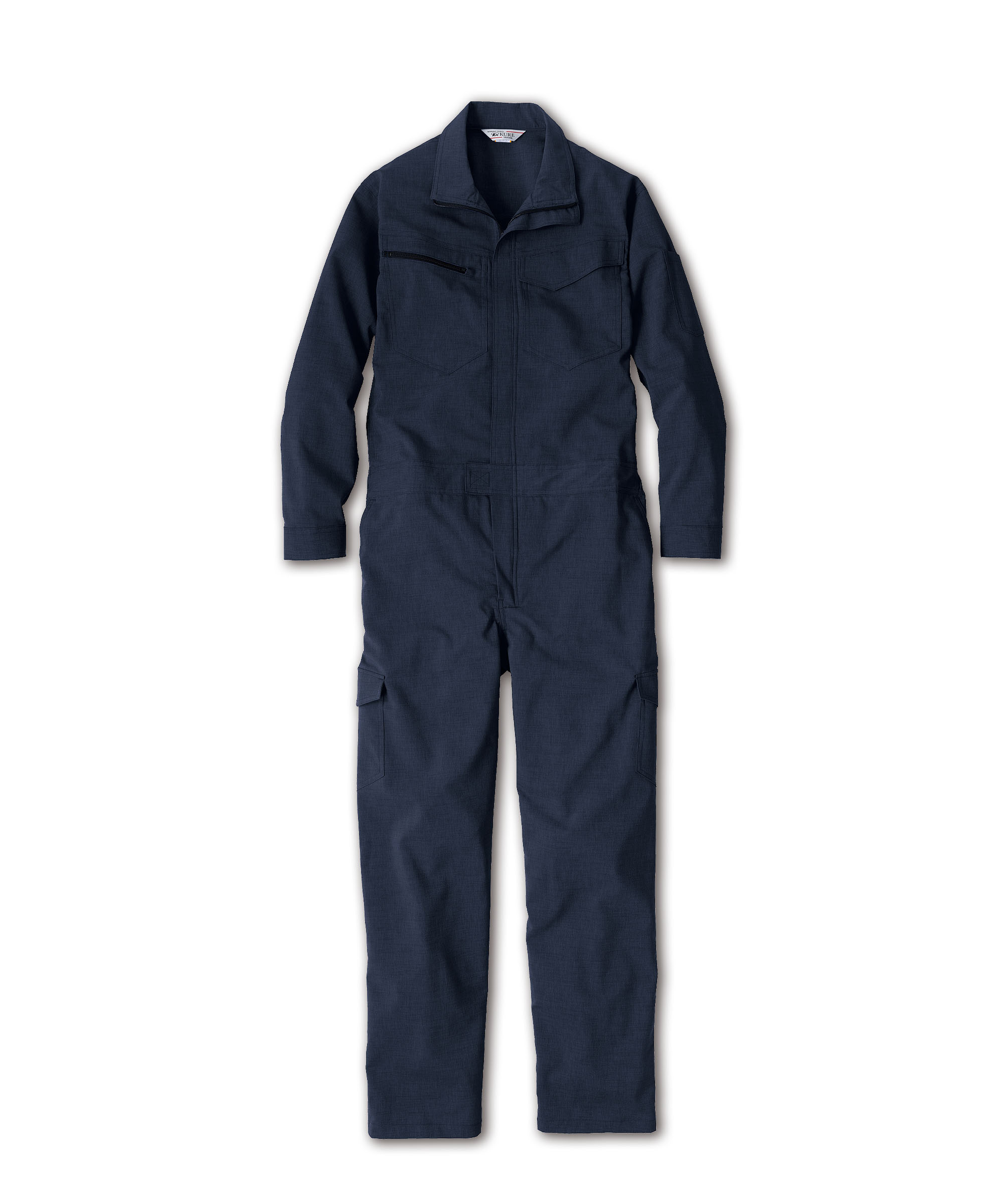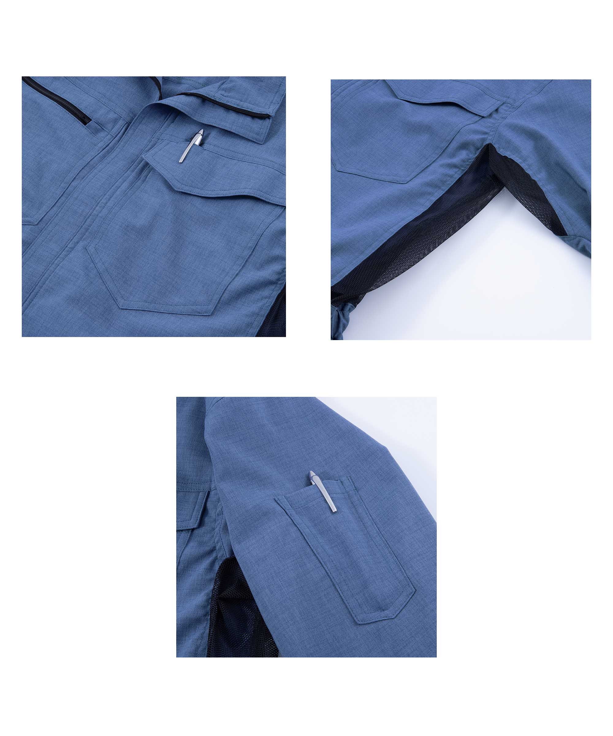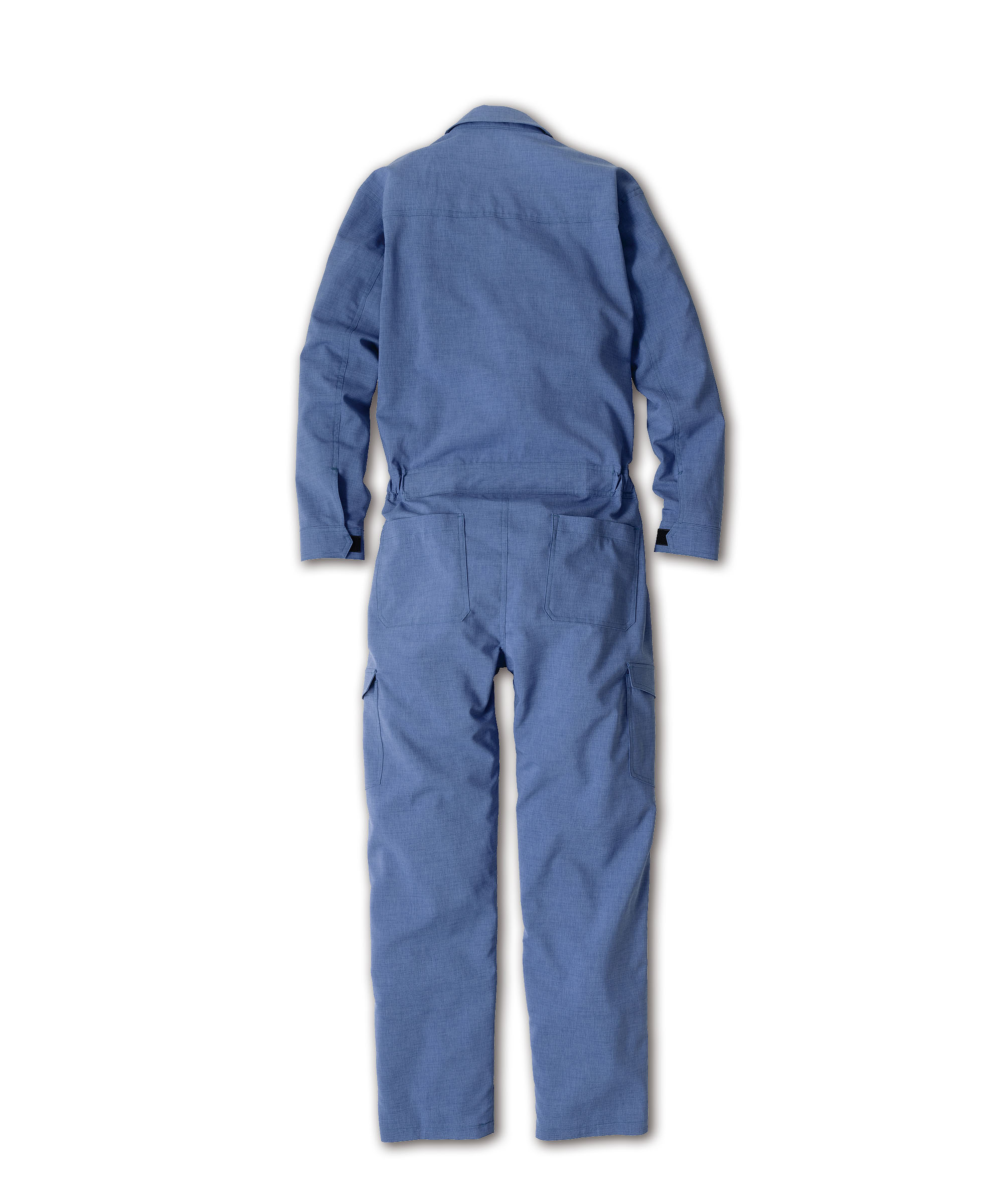 背中、前ヨークにメッシュ素材を採用し、通気性のある夏にぴったりのつなぎです。