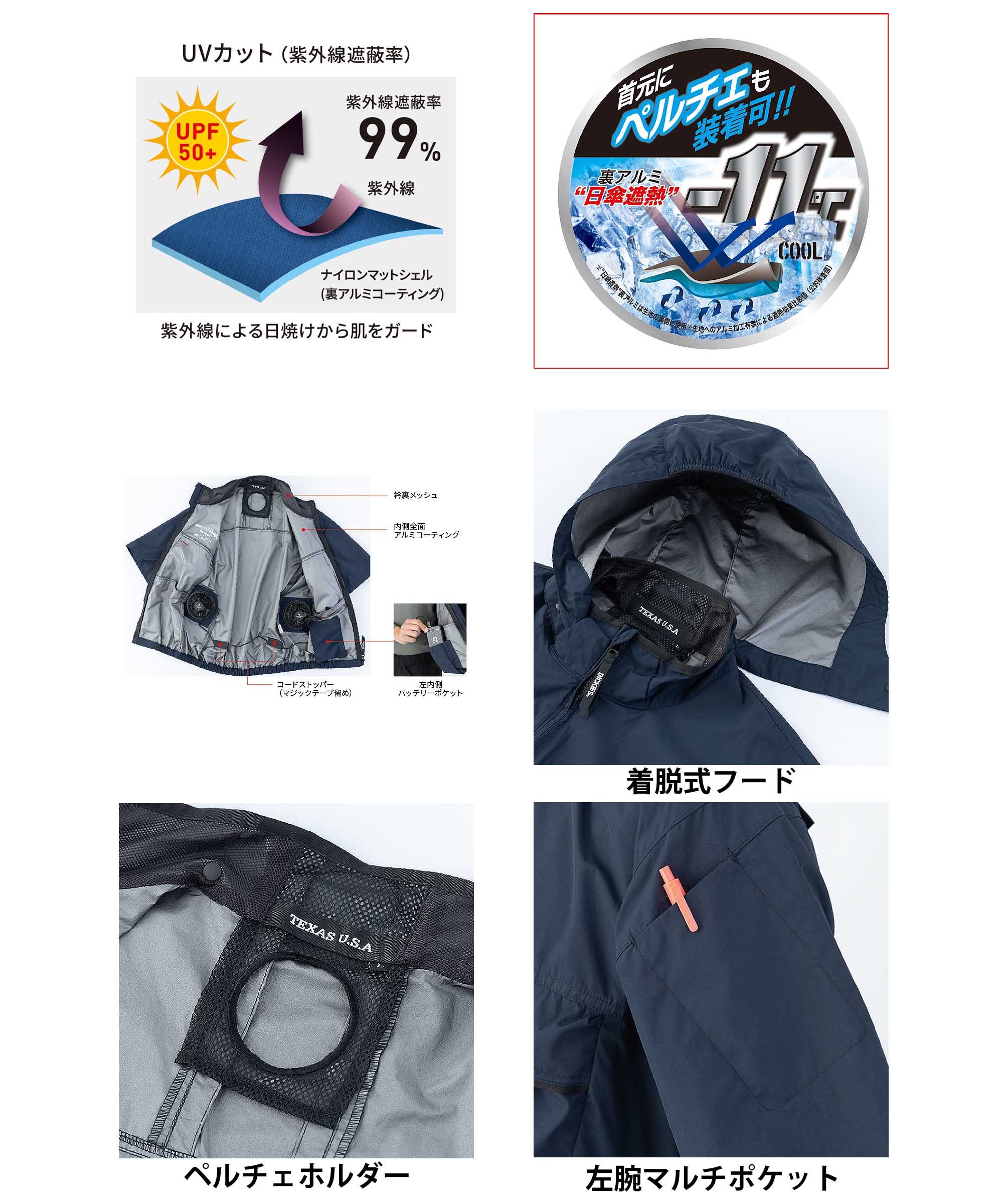 機能: サイドファン 着脱式フード ペルチェ着用可 サイズSはレディース対応