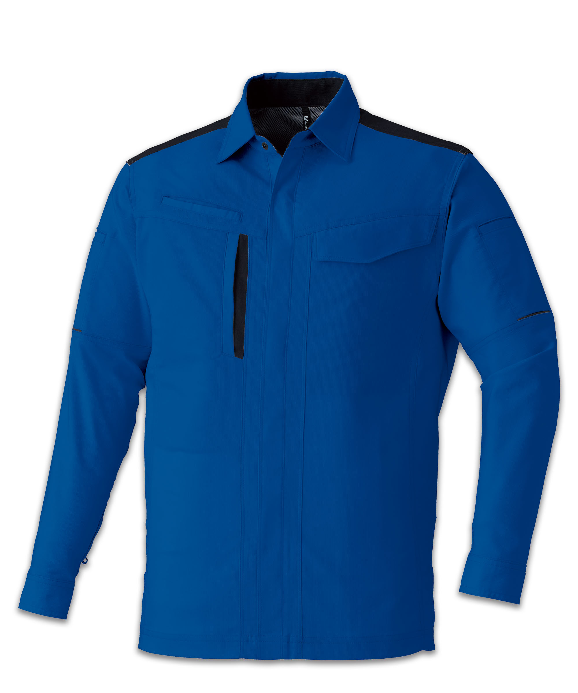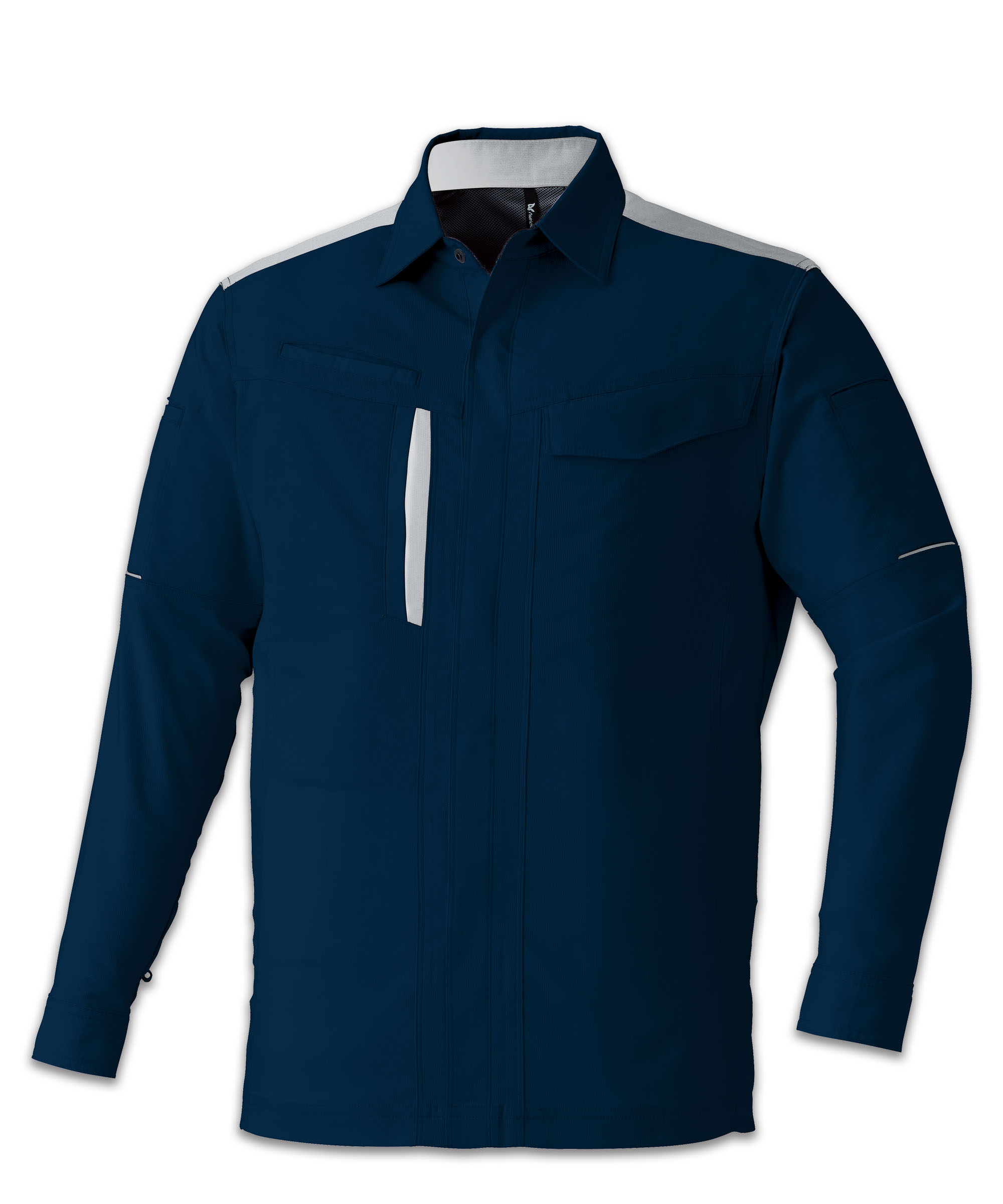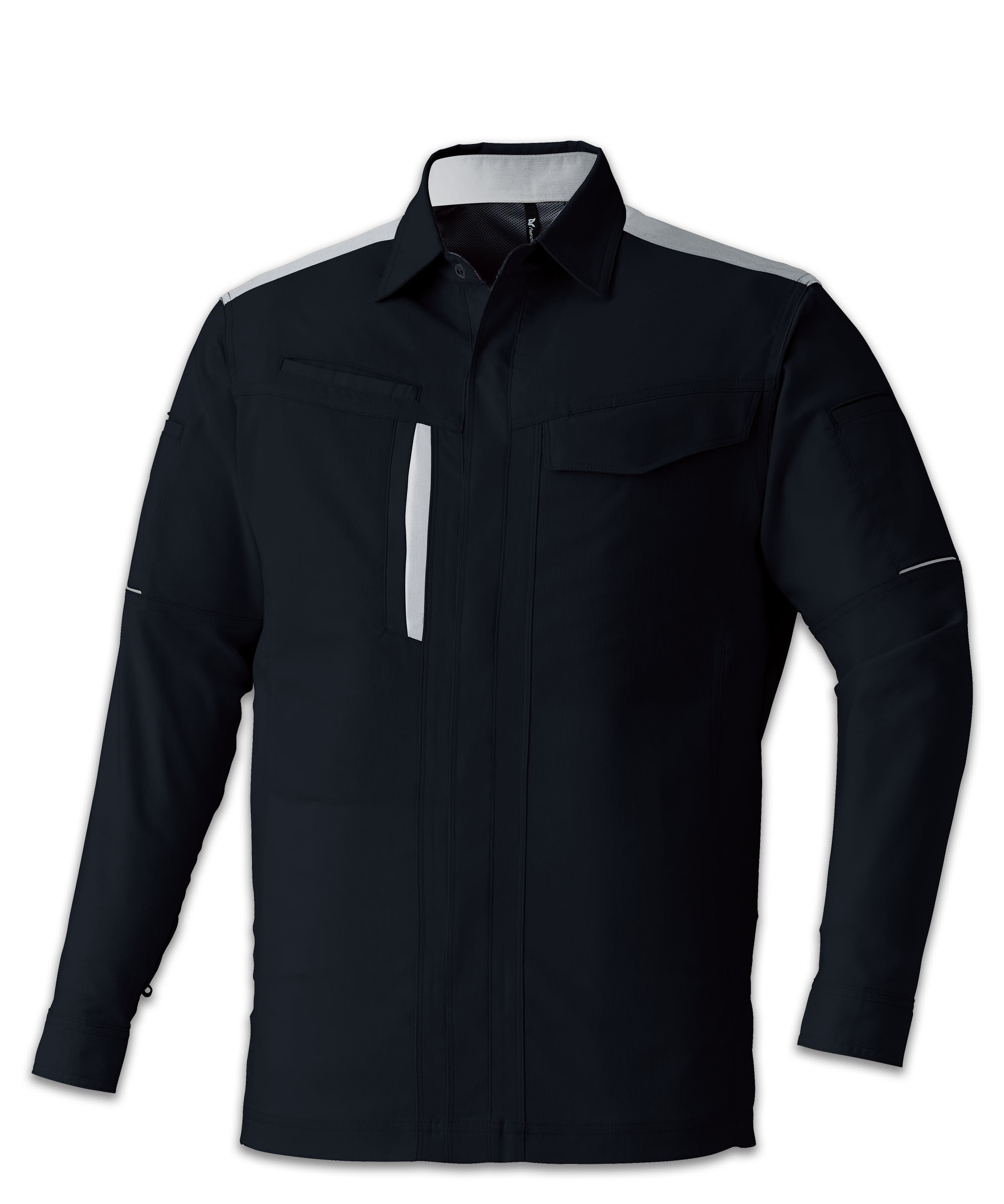 機能: 背裏一部メッシュ、両袖ペン差し、衿配色仕様、反射材使用