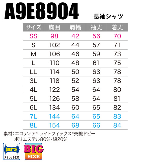 サイズ: SS / S / M / L / LL / 3L / 4L / 5L / 6L / 7L / 8L