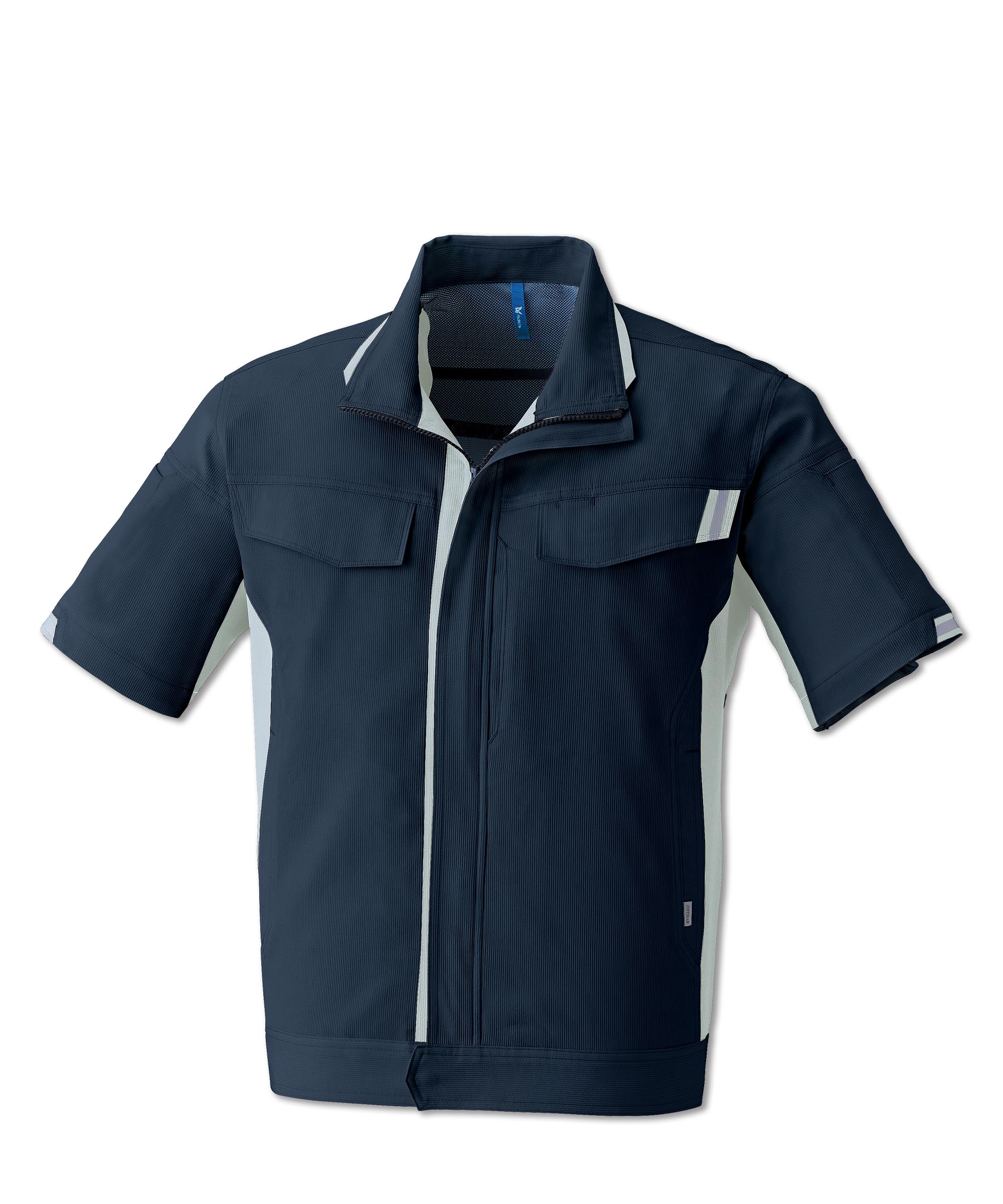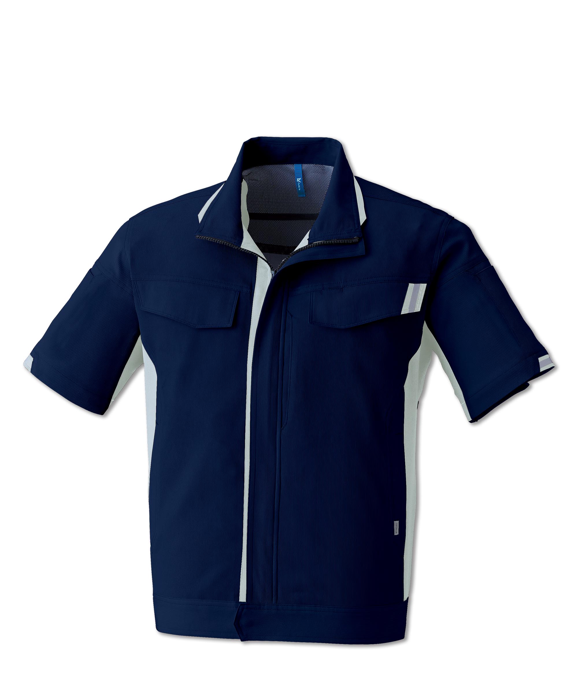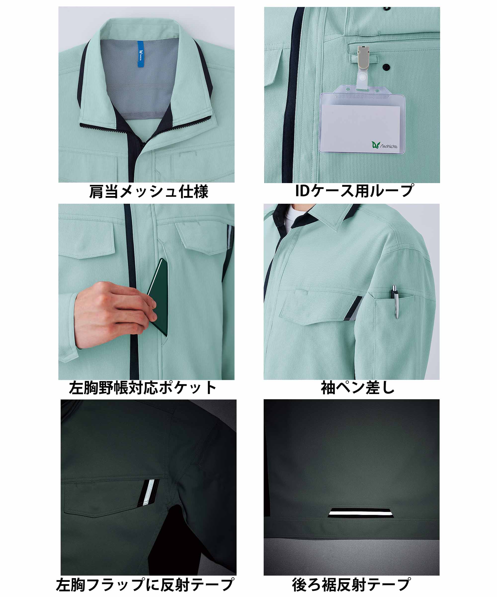 機能: 背裏一部メッシュ、両袖ペン差し、衿配色仕様、反射材使用