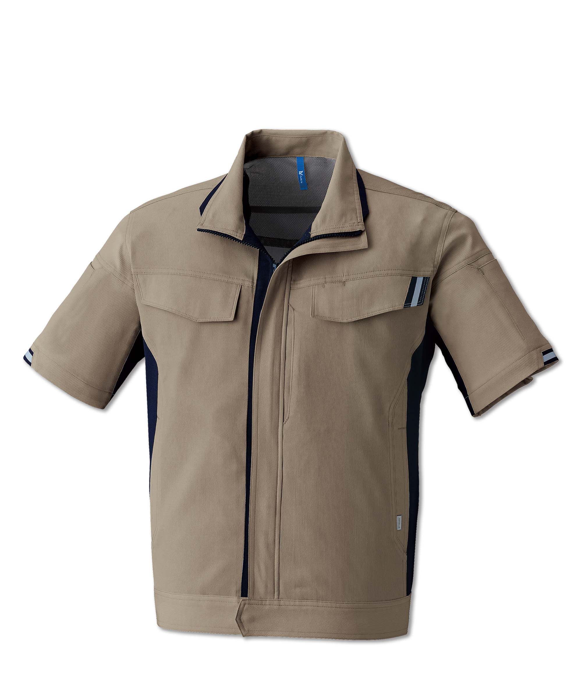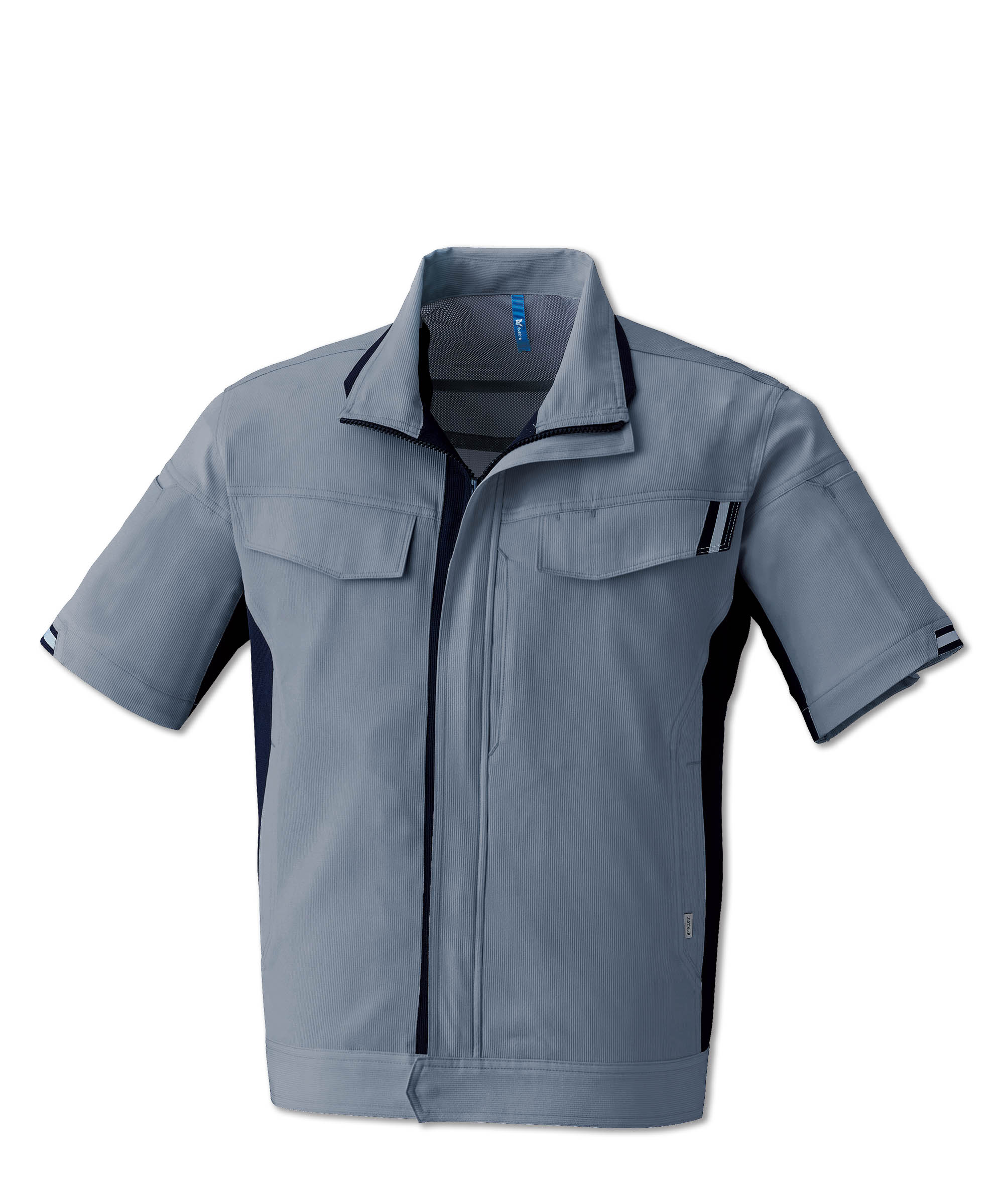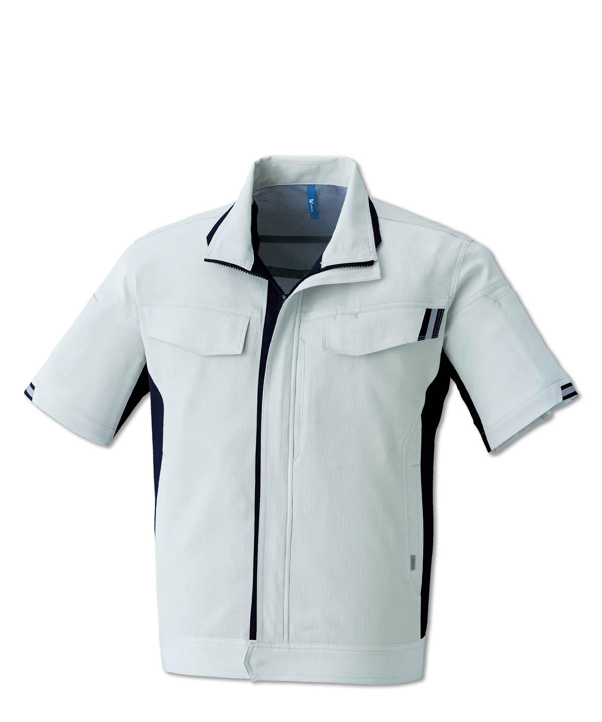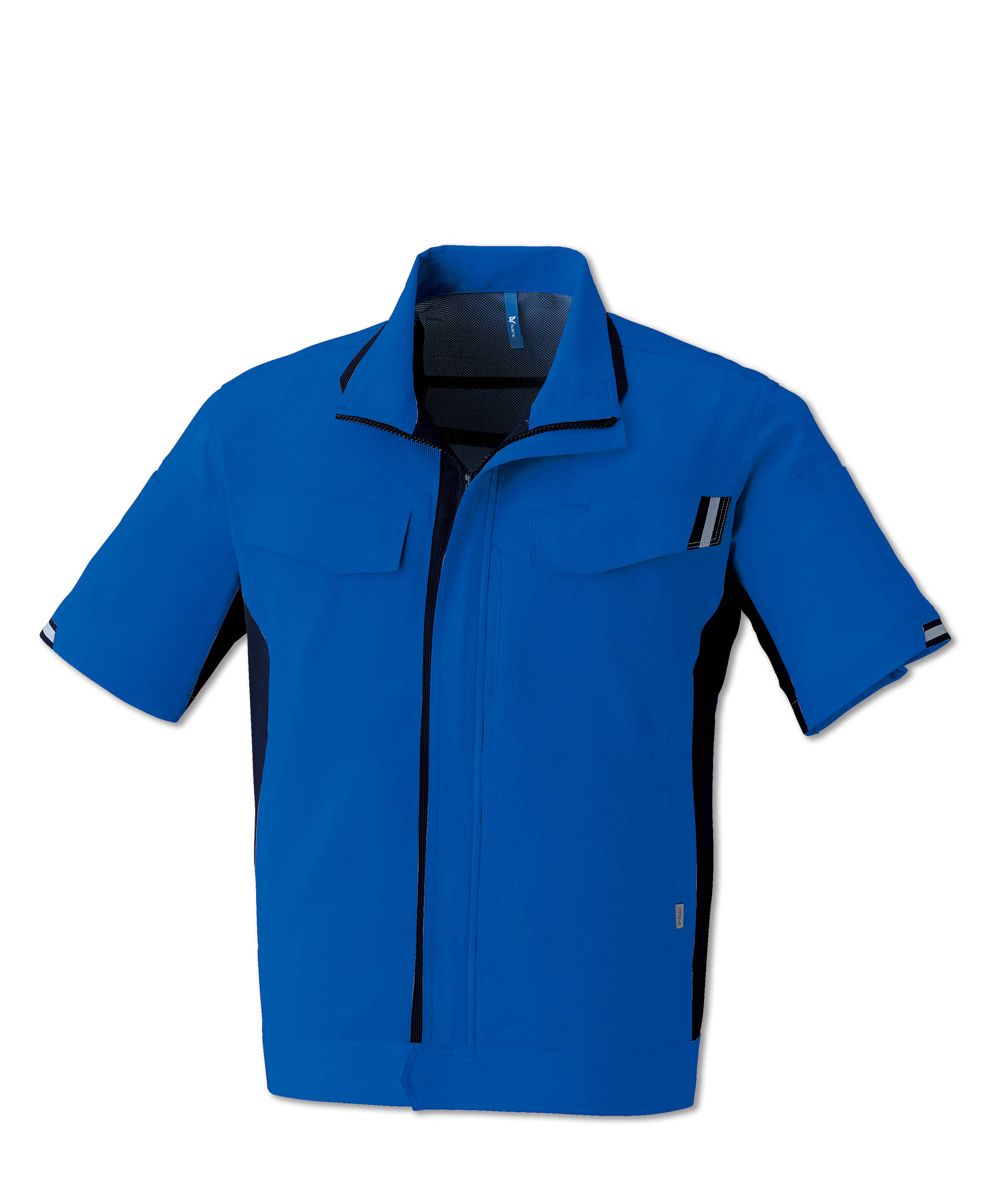 機能: 背裏一部メッシュ、両袖ペン差し、衿配色仕様、反射材使用