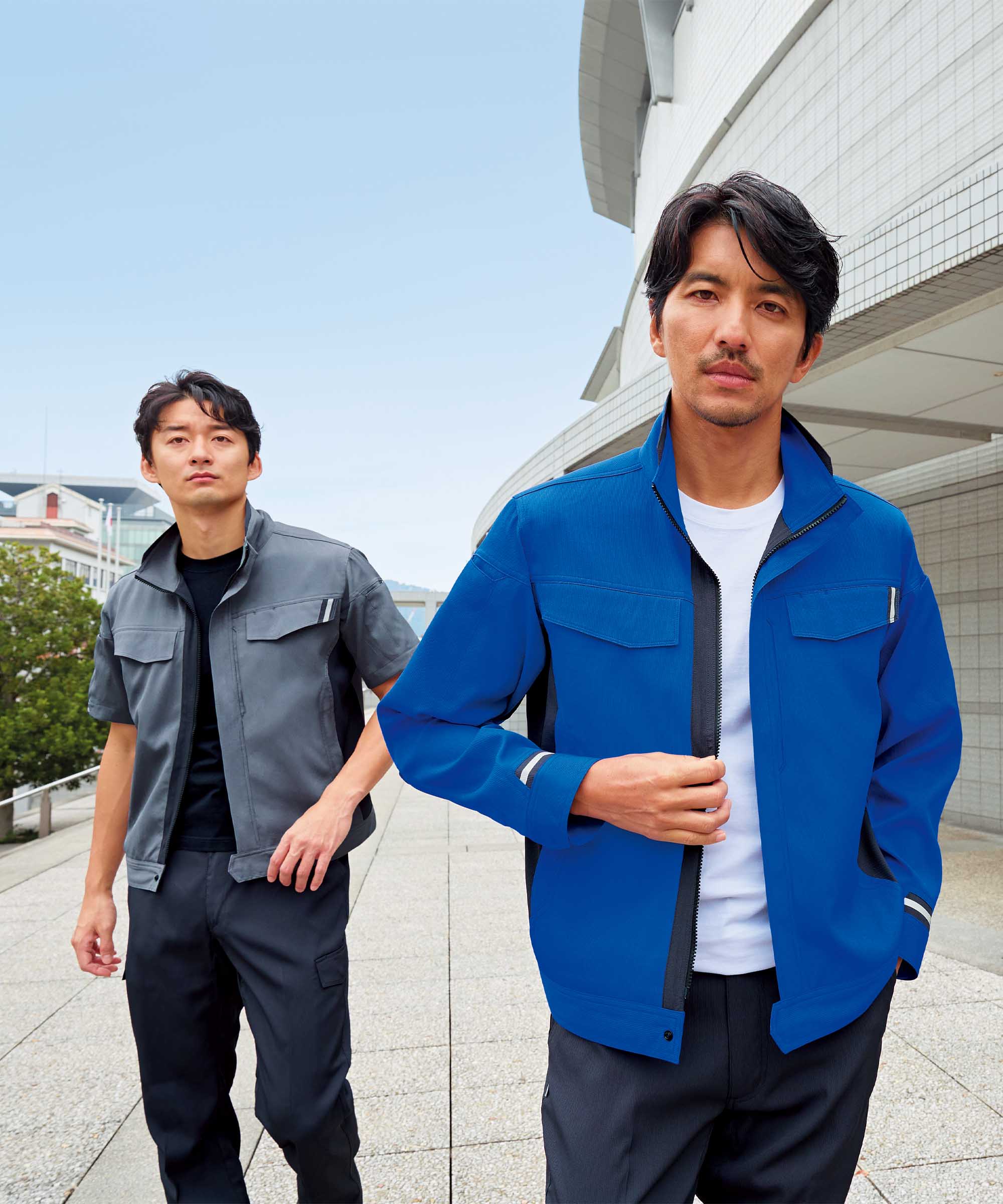 帯電防止性能とストレッチ機能素材の採用、さらにべとつき防止素材でストレスを感じにくく、働きやすさを考慮しています。夜間の視認性を高める再帰性反射素材使用。